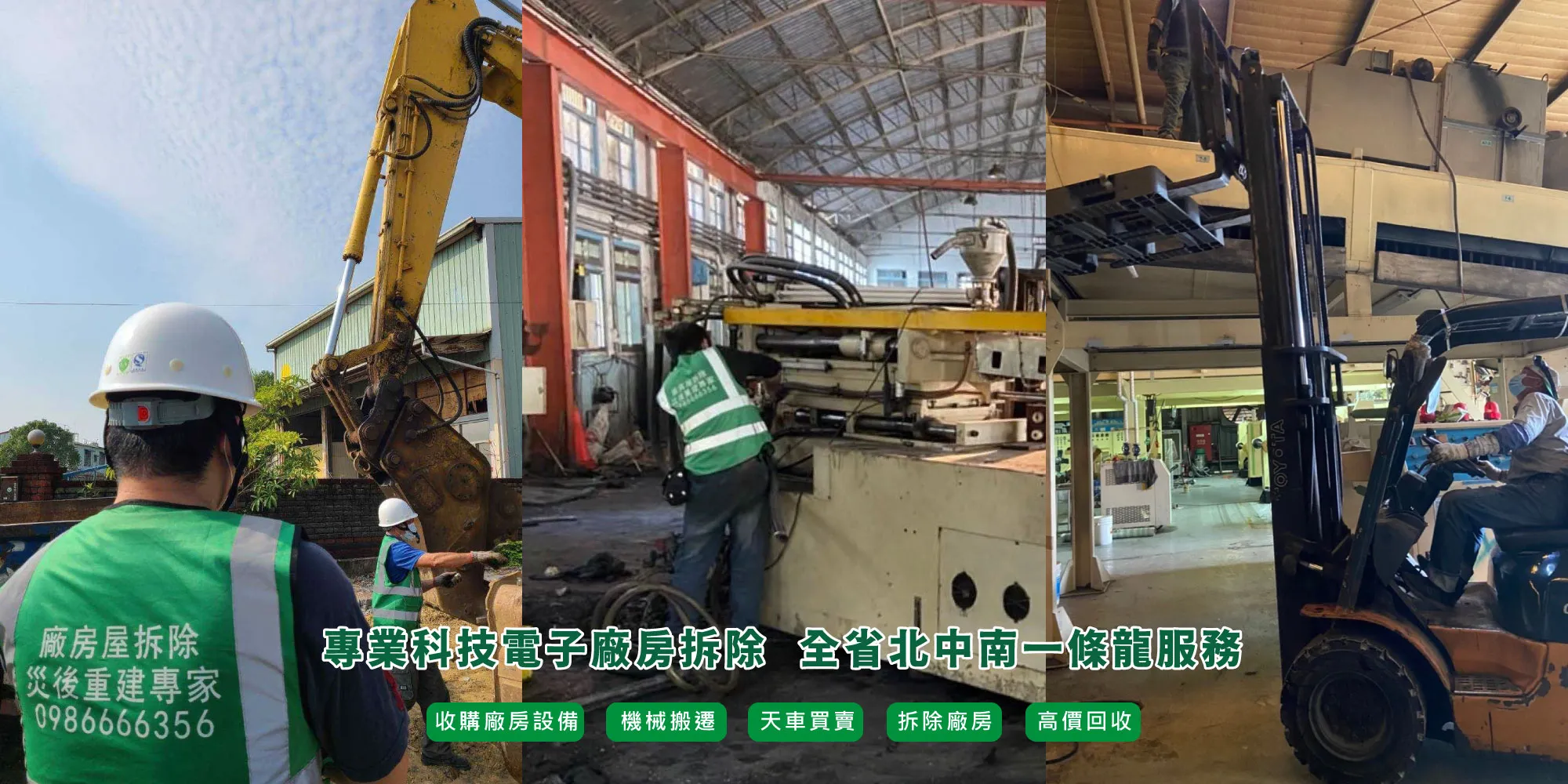 - 特別針對高科技半導體廠、蝕刻機、曝光機、拋光研磨設備、光電、太陽能板、生技、醫療、食品、石化、營建、紡織、橡膠、塑膠、牲畜業、塗佈、濺鍍機、空調冰水機、印刷造紙、化纖維、成衣、染整、運動器材等廠房,提供設備拆除與收購服務。